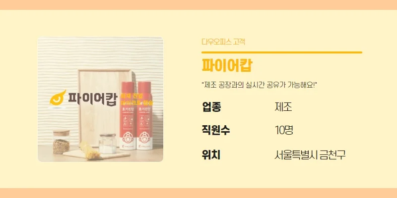 파이어캅은 어떤 회사인가요? > 제조업 👨‍🔬 파이어캅은 2018년에 설립된 회사로서 인간의 귀중한 생명과 재산을 보호하는 소방업계의 NO.1 Leading의 비전을 목표로 화재예방과 초기 화재진압을 위한 제품을 개발하고 있습니다. 🏠 파이어캅 홈페이지 www.firecop.co.kr 다우오피스 도입 계기를 알려주세요! > 제조 공장과의 매출입 내역을 실시간으로 공유가 가능해서 🙂 회계 설루션 업체를 찾다가 사용하고 있는 그룹웨어 다우오피스에서 경리회계 서비스가 출시되었다고 하여 사용하게 되었습니다. 제일 우선시되는 기능은 공유 기능이었는데, 다우오피스 경리회계는 거래명세서 매출입내역을 실시간으로 확인이 가능하여 제조공장과 공유를 손쉽게 할 수 있어 두 번 일하지 않게 되었습니다. 다우오피스 도입 후 달..
