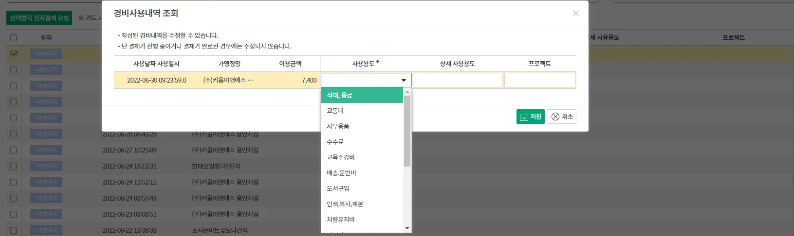 [다우오피스 경비관리 - 경비 사용용도 지정]