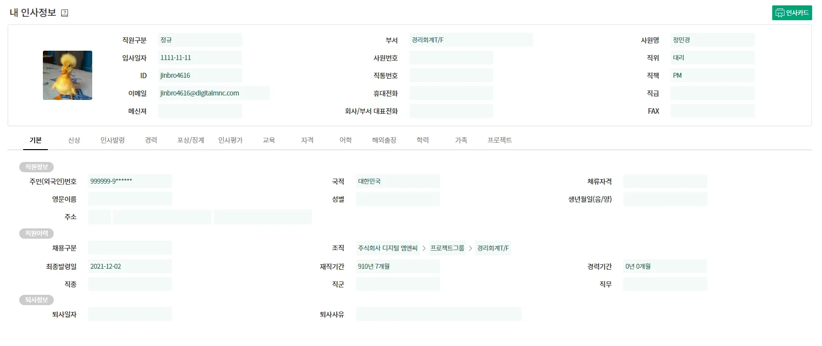 사원 정보관리에서 관리되는 내 인사정보를 직접 확인할 수 있습니다. 인사 담당자의 권한 없이도 본인 인사 정보 확인 및 출력이 가능하니 인사 담당자 업무를 덜어주는 편리한 기능입니다! 오른쪽 상단의 인사카드에서 필요한 정보를 자유롭게 출력할 수 있으니 참고하시기 바랍니다!
