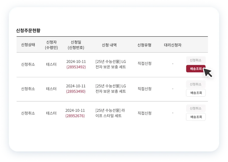 임직원이 직접 신청 내역 배송 현황을 조회할 수 있어요.
