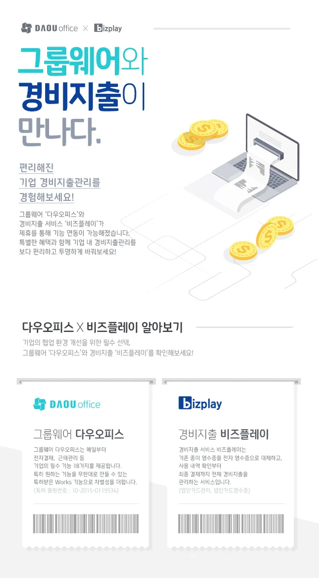 두 가지 제품 연동하시고 더욱 더 편리하게 지출관리 하세요! 그룹웨어 다우오피스와 경비지출관리 비즈플레이가 만나다!
