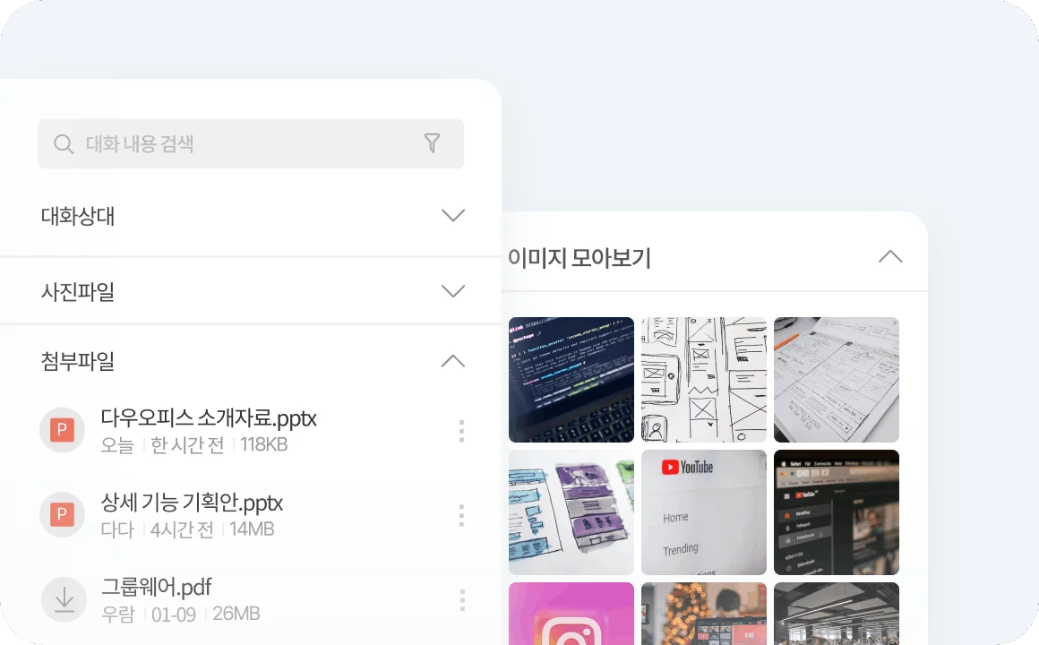 - 부가정보 영역 > [사진 더보기]와 [첨부파일 더보기]를 클릭하면 이미지와 첨부파일을 모아볼 수 있어요. 채팅방에서 주고받은 이미지와 첨부파일을 한 번에 모아보고, 다운로드 하고 싶다면 이 기능을 활용해 보세요!