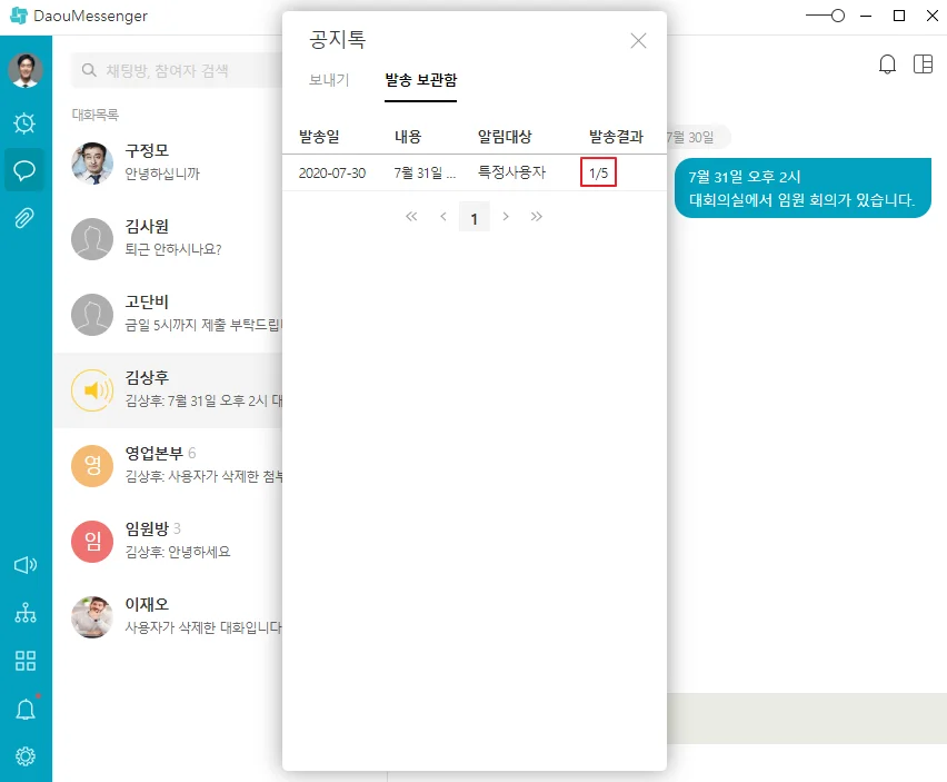 - 전송된 메시지는 PC 메신저를 통해 🔊 메시지로 전달되며, 대화방에서 내용을 확인할 수 있어요. 관리자는 ‘발송결과’를 통해 공지톡을 읽은 사람의 수를 확인할 수 있어요.