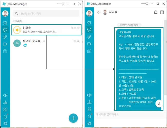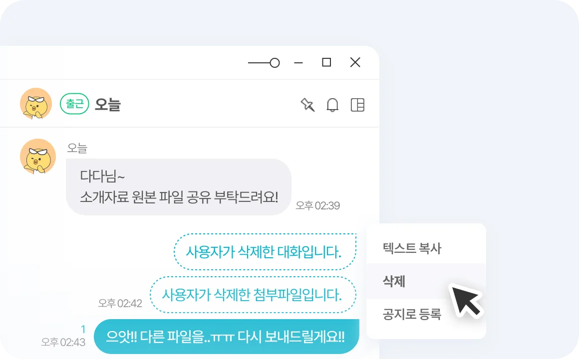 - 다우오피스 메신저에서는 잘못 보낸 메시지나 첨부파일을 확인 여부에 상관없이 바로 삭제할 수 있어요!