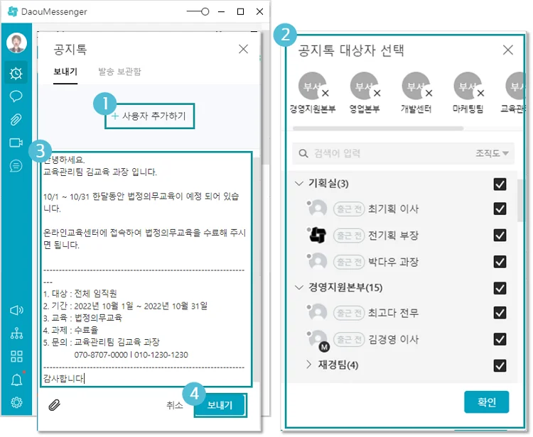 - 메신저 좌측 공지톡(🔊) 아이콘 > ‘+ 사용자 추가하기’ > 공지 메시지 입력 > 보내기
