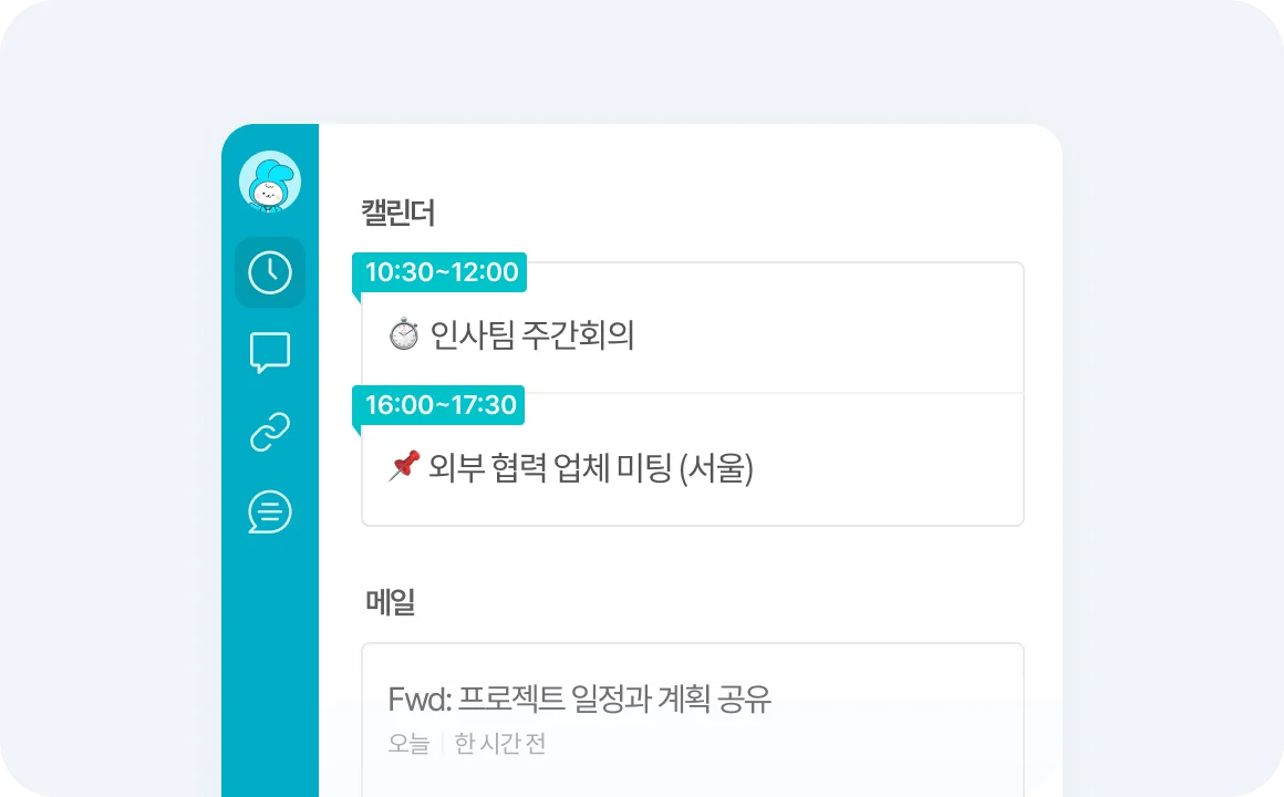 - PC메신저 왼쪽 상단 [Today] 또는 모바일 앱 하단 두 번째 메뉴 [Today] 기능을 활용해 캘린더, 메일, 전자결재, 보고 등을 한 눈에 확인할 수 있어요.