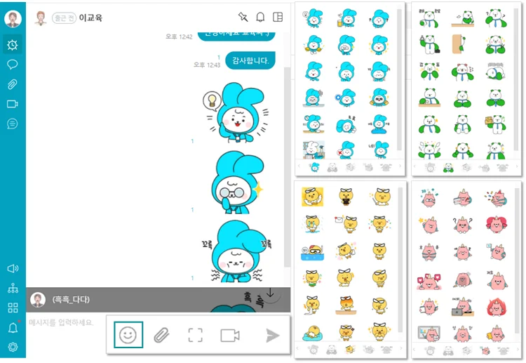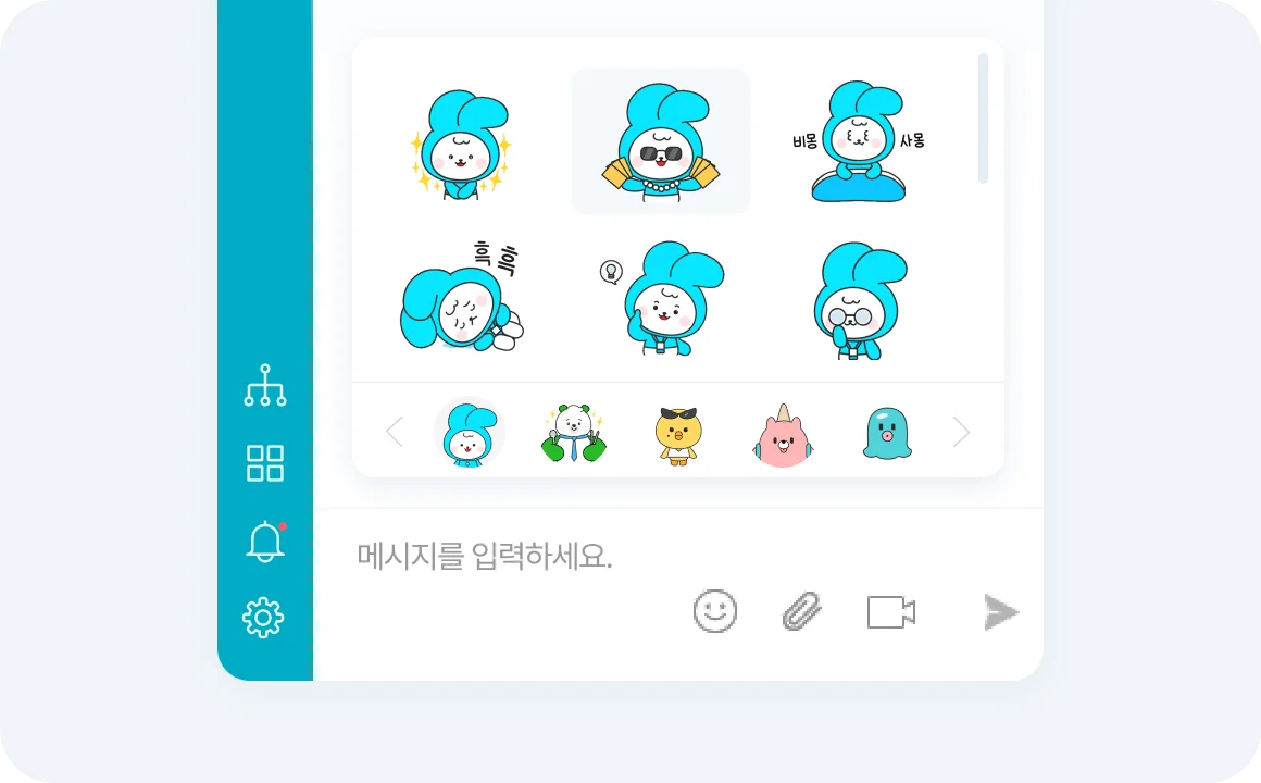 - 다우오피스 메신저에서는 다우오피스 대표 캐릭터 <ONE TEAM> 이모티콘 150여 종이 무료로 제공되고 있어요.