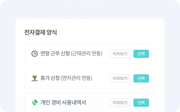 전자결재는 업무 보고 뿐만 아니라 휴가, 연차 등 회사 생활에서 꼭 필요한 기능이죠.