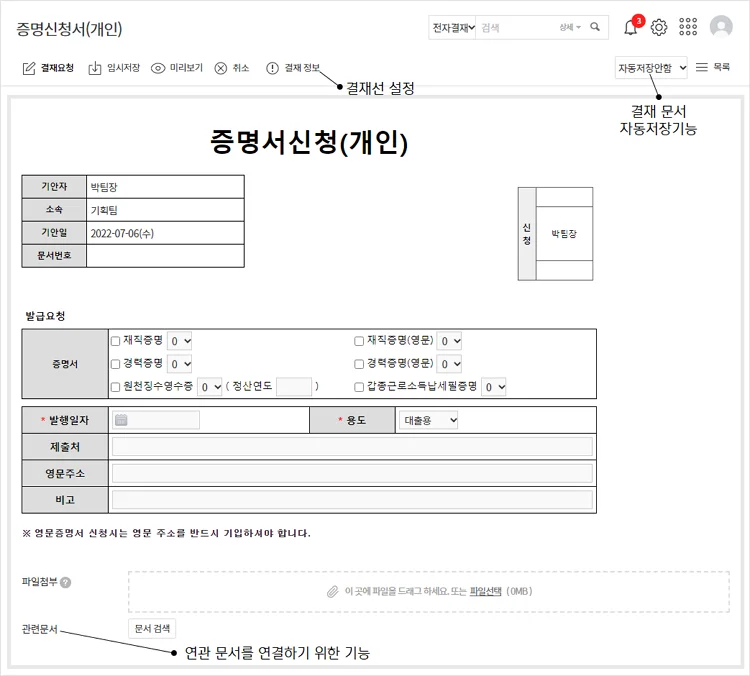 파일 첨부, 결재선 자동 생성, 모바일 결재 지원 기능으로