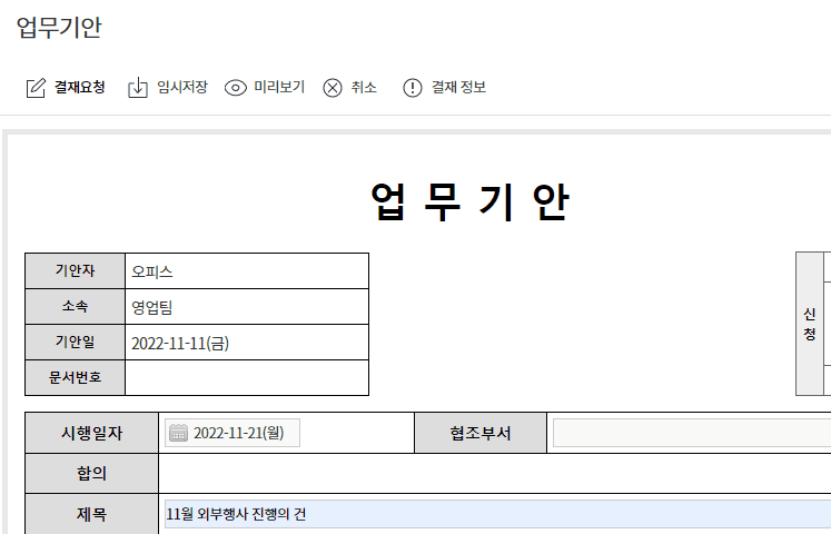 - 결재 기안 시 작성해야 하는 결재 문서 양식은 기업, 부서, 업무 별로 정해져 있는 경우가 많아요.