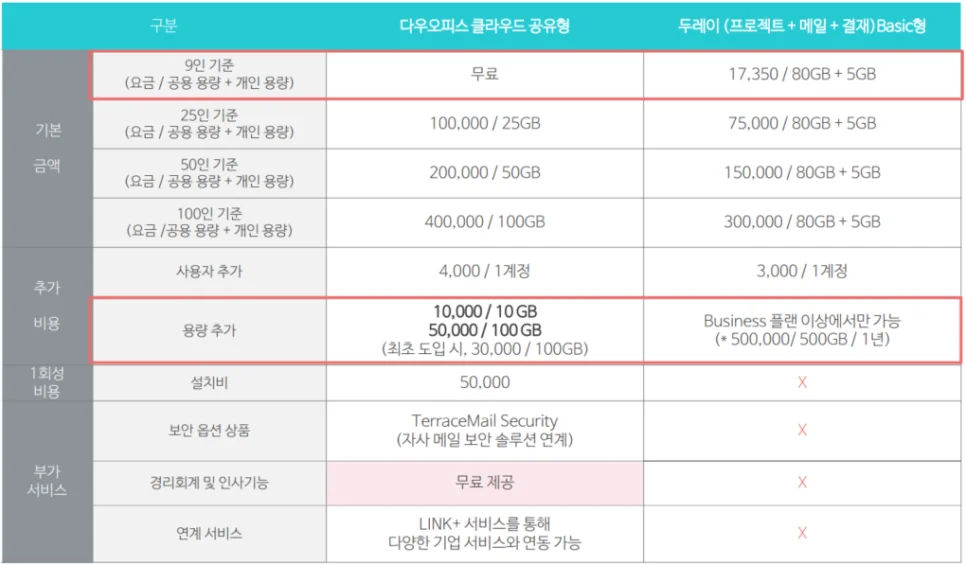 다우오피스 클라우드 공유형과 두레이 베이직 가격 비교 (단위 : 원 / 월)