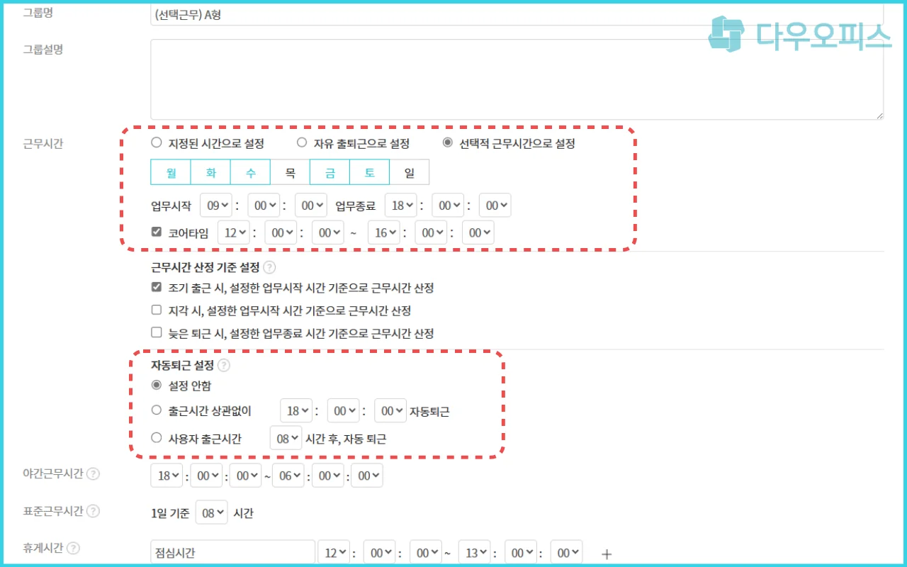 2) 선택적 근무제의 경우 필수로 근무해야 하는 코어타임 설정이 가능합니다.