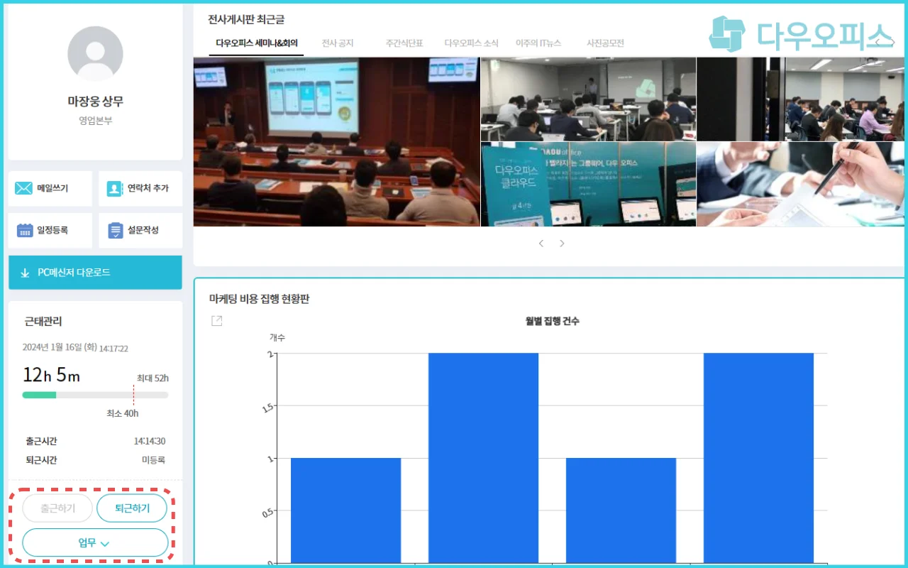 1)다우오피스는 출근 후 PC/모바일에서 출근 버튼을 클릭하면 출근 시간이 자동으로 기록됩니다.