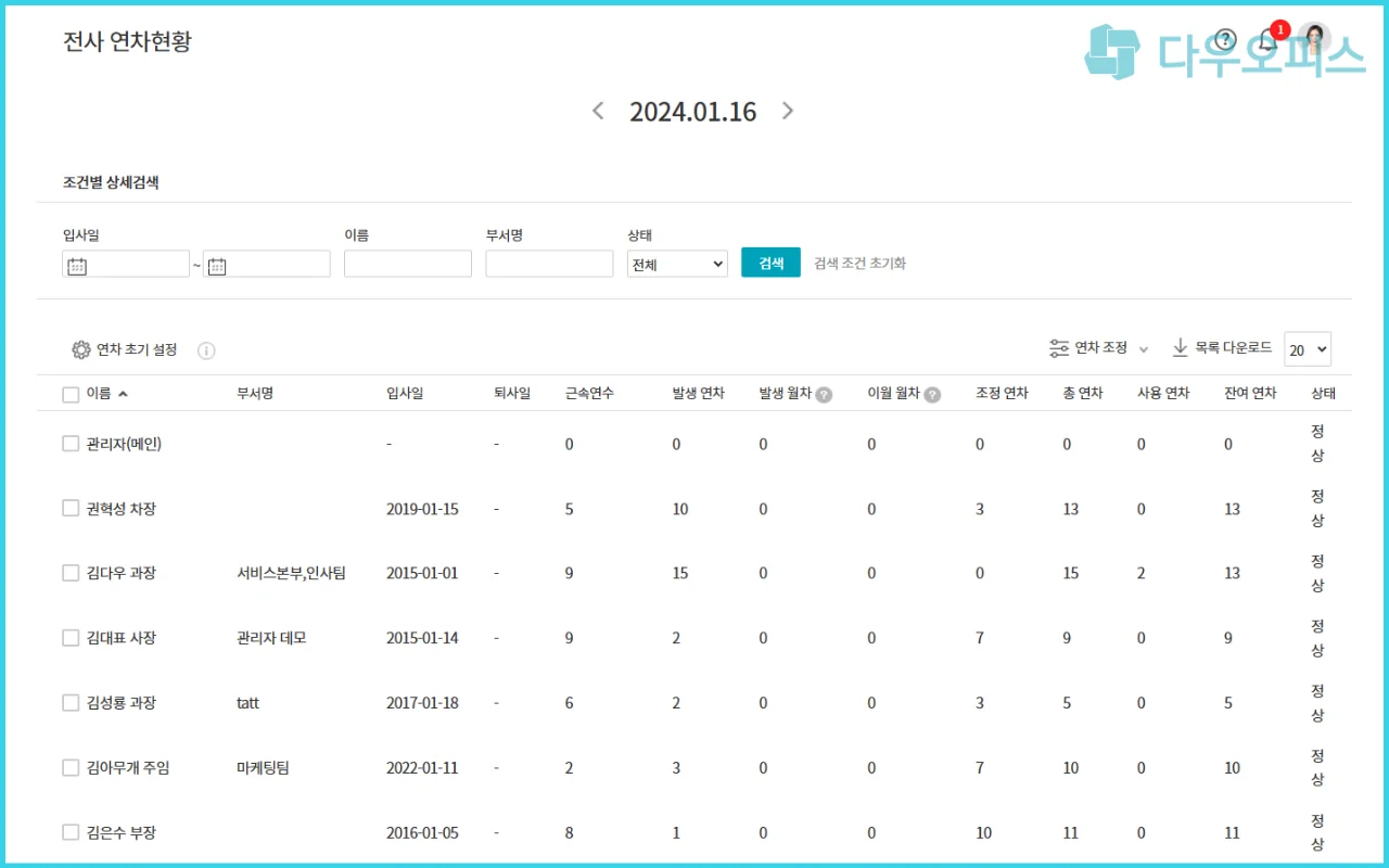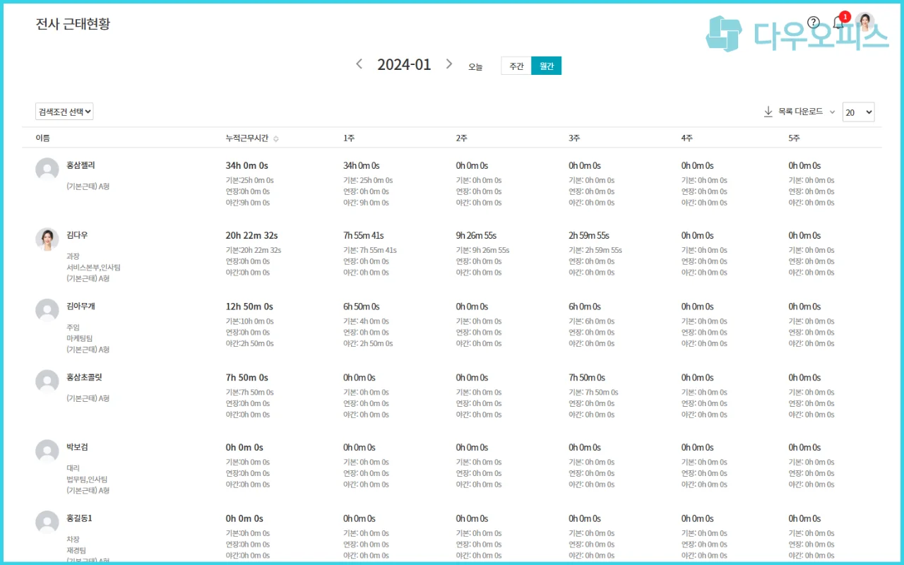 관리자와 사용자가 모두 사용하기 편리한 다우오피스 근태관리