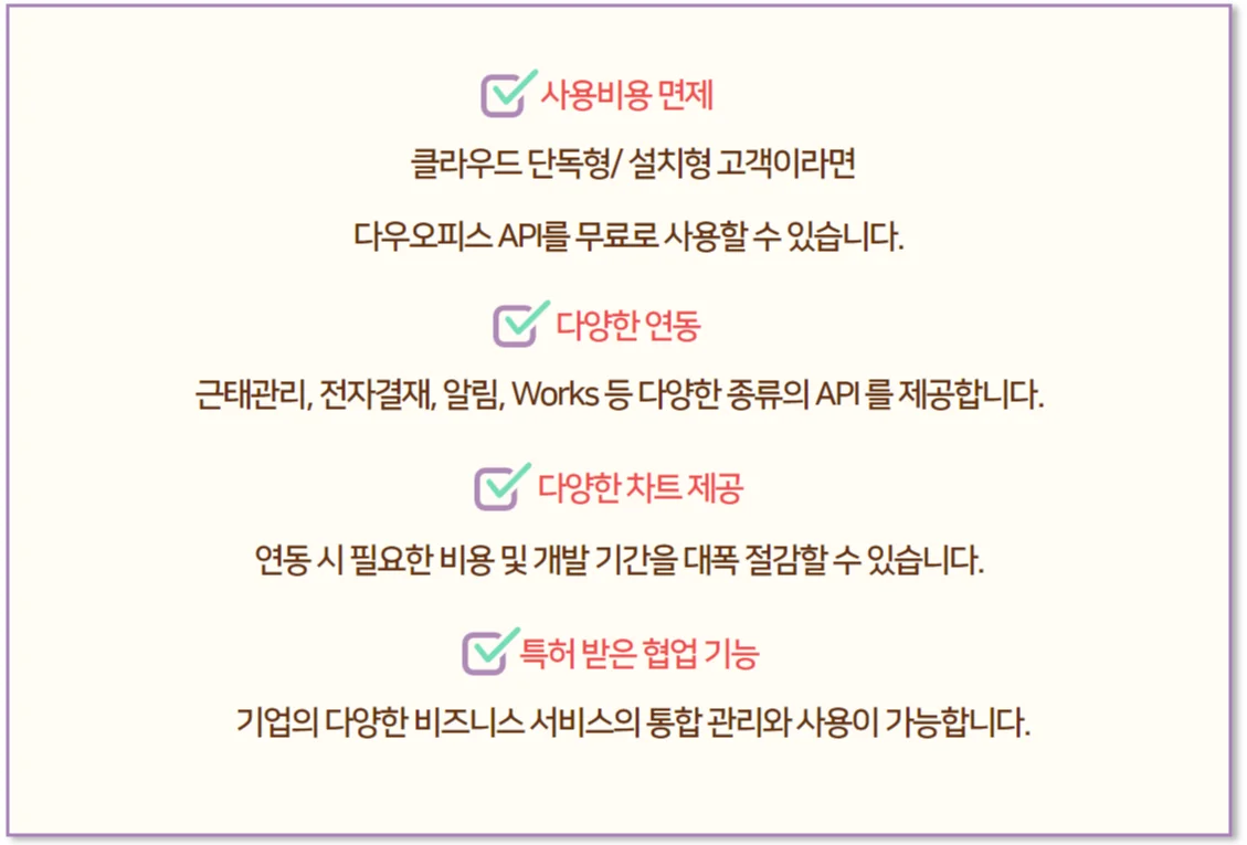 다우오피스 API를 통해 다양한 혜택을 제공받을 수 있습니다!
