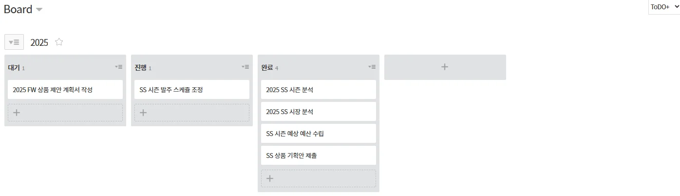시즌제로 운영되는 패션 업계 특성상 각 시즌마다 ToDO+로 투두리스트를 생성해 업무를 관리하고 있어요.