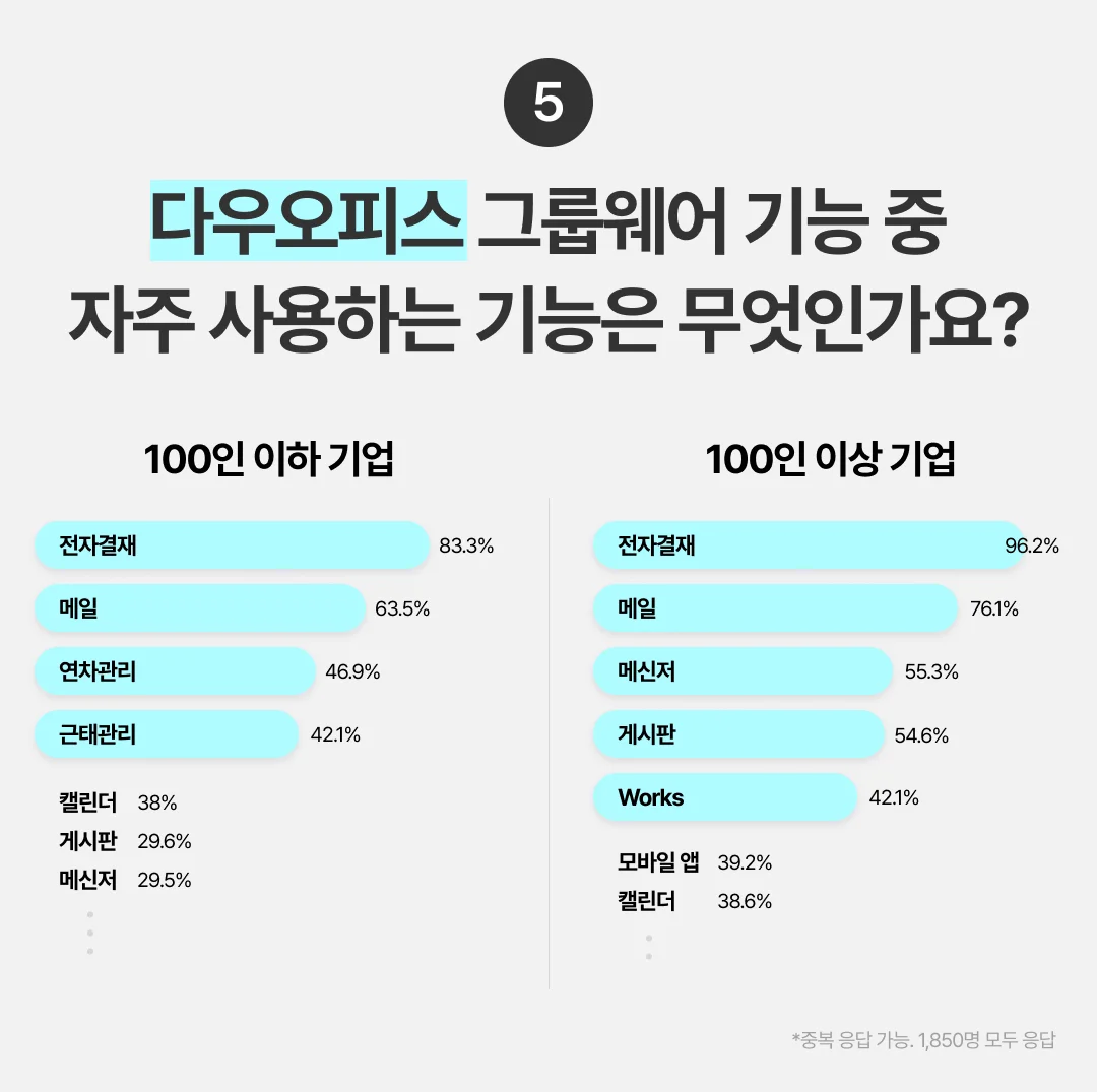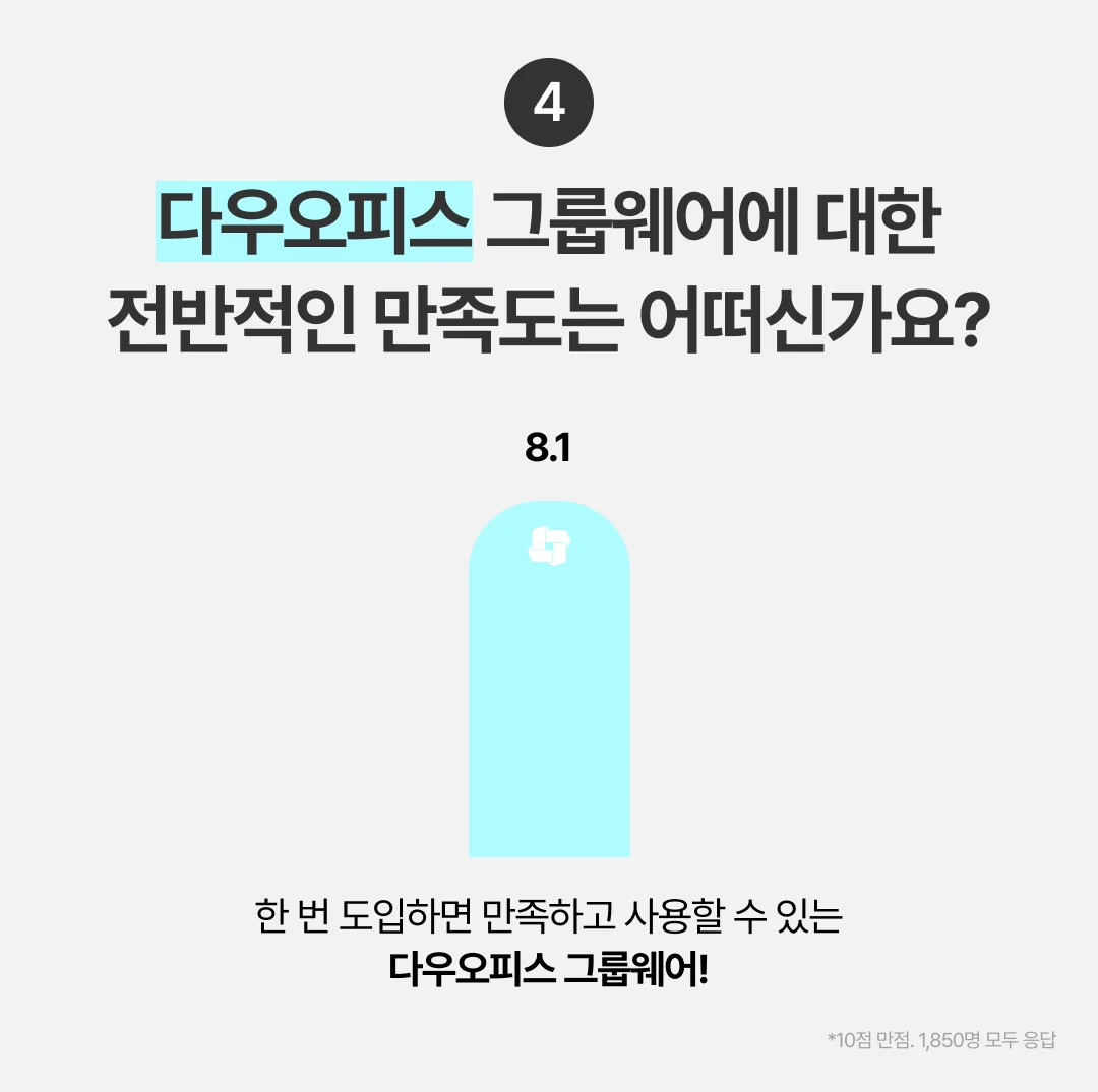 안녕하세요! 💙올인원 업무플랫폼 다우오피스입니다. 많은 분들이 수많은 업무 속에서 불필요한 업무 시간 낭비를 줄이고, 더욱 효율적으로 일하기 위해 고민하고 계십니다.특히, 이러한 업무 환경에서 업무 생산성을 높여주는 '그룹웨어'는 필수가 되었죠! 하지만 수많은 그룹웨어 중, 우리 회사와 팀의 업무 방식에 가장 적합한 그룹웨어는 무엇일지 고민이 되실 것 같아요. 🤔 직장인 독자 여러분의 선택에 도움이 될 수 있도록다우오피스 이용자분들이 솔직하게 응답해주신'만족도 조사' 결과를 공개합니다!다우오피스만의 강점, 자주 사용하는 기능 소개뿐만 아니라앞으로의 개선 방향까지! 함께 살펴보시죠! ◆ 조사 방법: 온라인 설문◆ 조사 대상: 다우오피스를 이용 중인 사용자◆ 조사 규모: 총 1,850명 Q. 다우오..