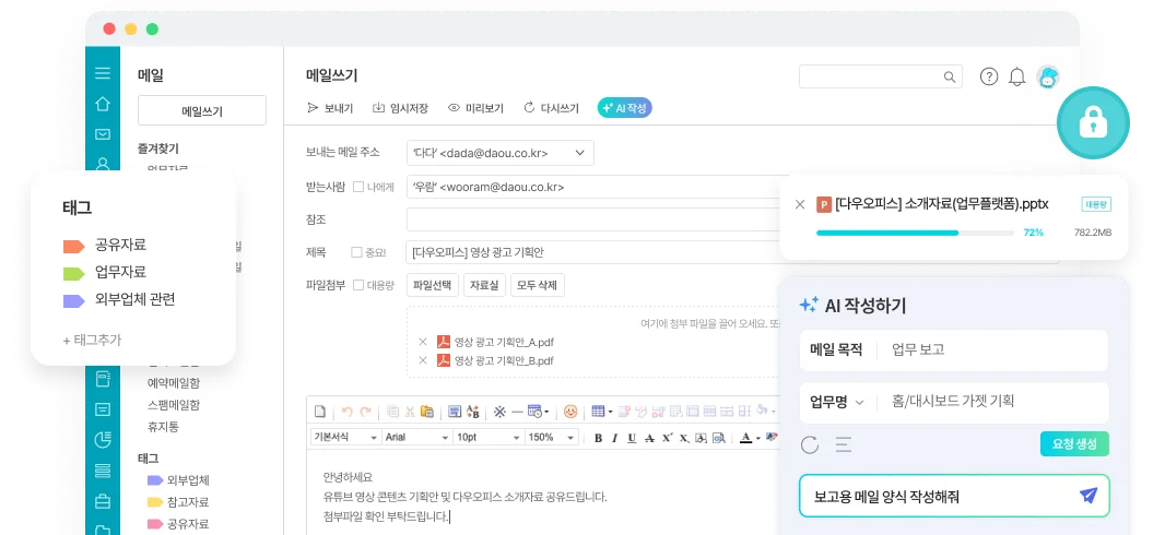 - AI 메일 작성 및 요약: 다우오피스에서는 장문의 메일, 일일이 읽지 않아도 됩니다! 다우오피스 AI 기능이 메일을 요약해주고 핵심 내용 입력 시 메일 초안도 작성해줘요.