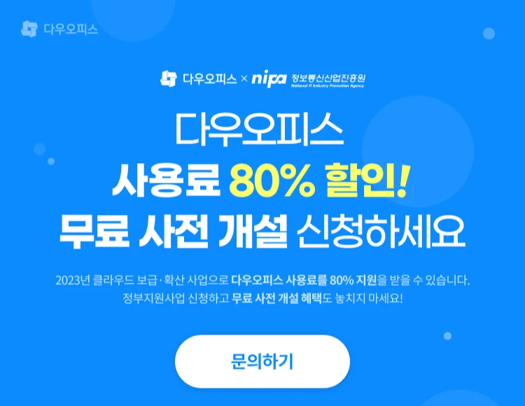 ------< 종료된 이벤트 입니다. >----- 안녕하세요 올인원 업무 플랫폼 다우오피스입니다🥰 정보통신산진흥원에서 진행하는 클라우드 보급·확산 사업으로 다우오피스 이용료를 80% 지원 받을 수 있어요! 선착순인 만큼 빠른 조기 마감이 예상되는데요! 지금 바로 무료 사전 개설 신청하세요⭐