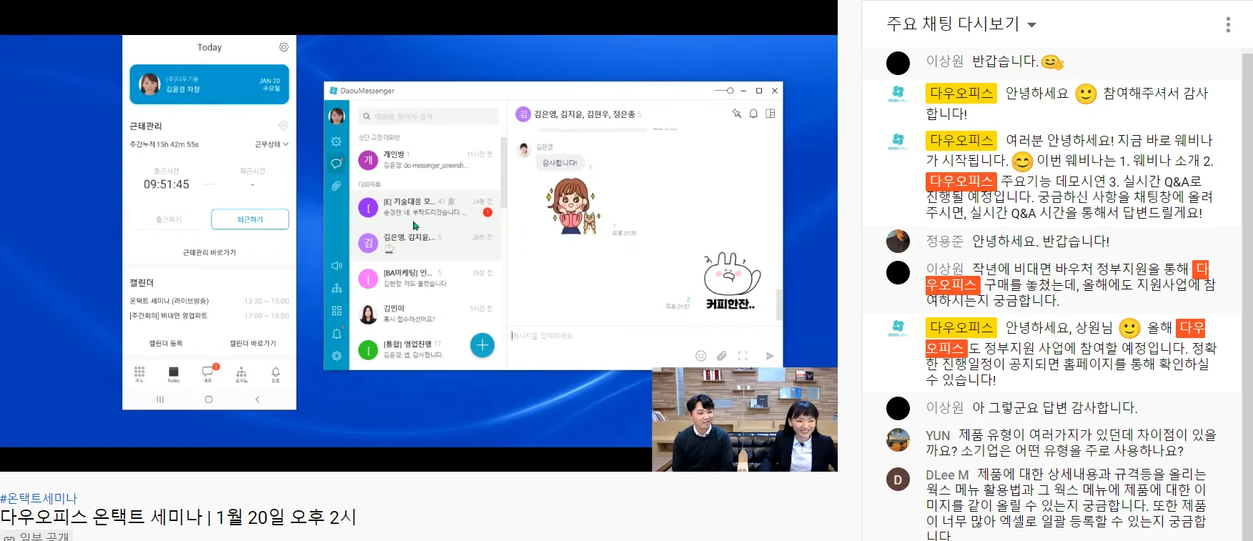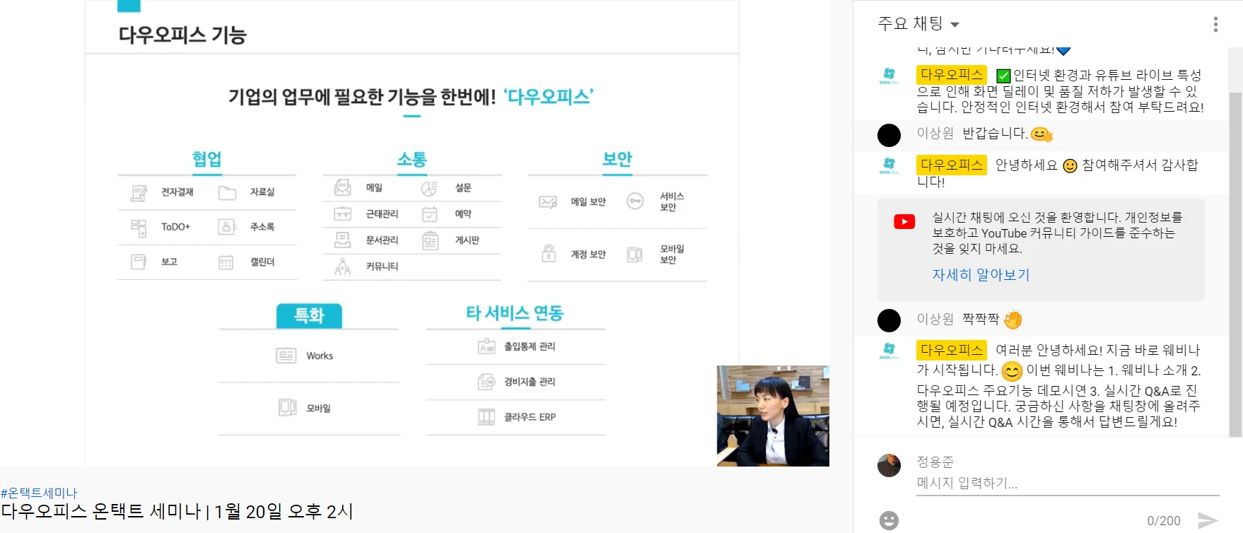 유튜브 라이브를 통해 그룹웨어 다우오피스 기능을 소개하고 데모를 시연하는 시간이랍니다. 😊
