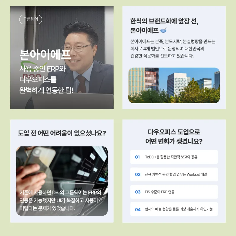 우리 회사랑 비슷한 업종, 비슷한 규모에서 실제로 다우오피스를 활용하고 있는 사례를 확인해 보실 수 있습니다.