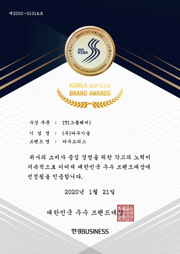 다우오피스, 2020 대한민국 우수브랜드 IT부문 대상 수상!