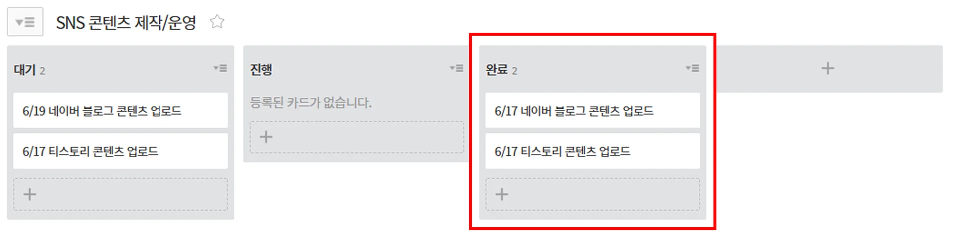 - 카드 추가대기, 진행, 완료 업무에 세부적인 할 일 카드를 추가할 수 있어요. 특히, '완료' 항목에 업무를 추가해두면 손쉽게 Done List를 작성할 수 있죠!