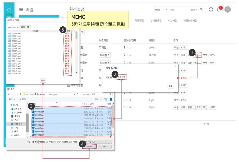 *'받은 메일함'에서는 업로드가 불가능하며, 이관할 메일은 반드시 추가된 메일함에서만 가능합니다.