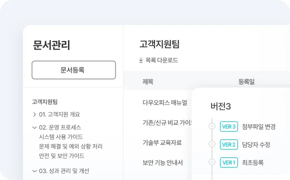 다우오피스 '문서관리' 기능은 전사/팀 단위로 공유할 문서들을 쉽고 간편하게 등록할 수 있습니다.