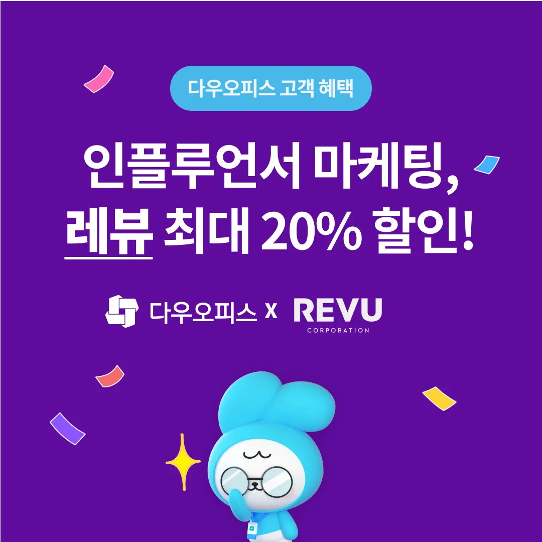 안녕하세요! 올인원 업무플랫폼 다우오피스입니다🥰 ​ 다우오피스를 이용하는 고객들에게 인플루언서 기반의 마케팅 서비스를 제공하는 '레뷰'의 서비스 이용료를 최대 20% 할인해드리고 있어요! 혜택에 대해 궁금하시다면 아래 이미지에서 확인해보세요😉 ​ 현재 다우오피스 고객이 아니어도 지금 다우오피스를 무료로 시작하시면 지금 바로 레뷰 혜택을 신청할 수 있다는 사실! ​ 다우오피스도 무료로 이용하고 레뷰의 이용료 할인 혜택도 받으니 인플루언서 기반 마케팅 서비스를 이용 하고자 하는 분들에게는 상당히 좋은 기회에요! ​ 👇이벤트와 관련된 자세한 내용은 아래에서 확인하실 수 있어요👇