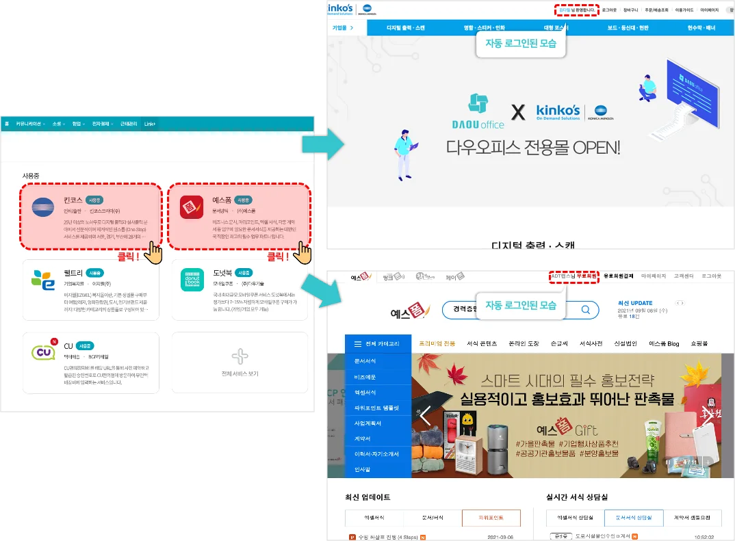 Link+에서는 별도의 개발인력 비용이 소요되는 가입 및 SSO(Single Sign On, 한 번의 로그인으로 여러 서비스 로그인 가능) 연동 기능을 무료로 제공하고 있었습니다. 그 덕분에 다우오피스를 통해서 예스폼과 킨코스 서비스 연동 신청 시, 자동으로 해당 서비스에 접속되어 계정 연동 가입이 가능했고 이후에는 Link+를 통해서 별도의 로그인 없이 클릭 몇 번만으로 원하는 서비스에 접속이 가능했습니다. 그뿐만 아니라 예스폼의 수많은 문서 서식을 활용하여 효율적인 업무처리가 가능하였고, 킨코스를 통해 온라인으로 인쇄물을 주문하면 전국 28개의 매장에서 출력 후 빠르게 인쇄물을 받을 수 있었습니다.