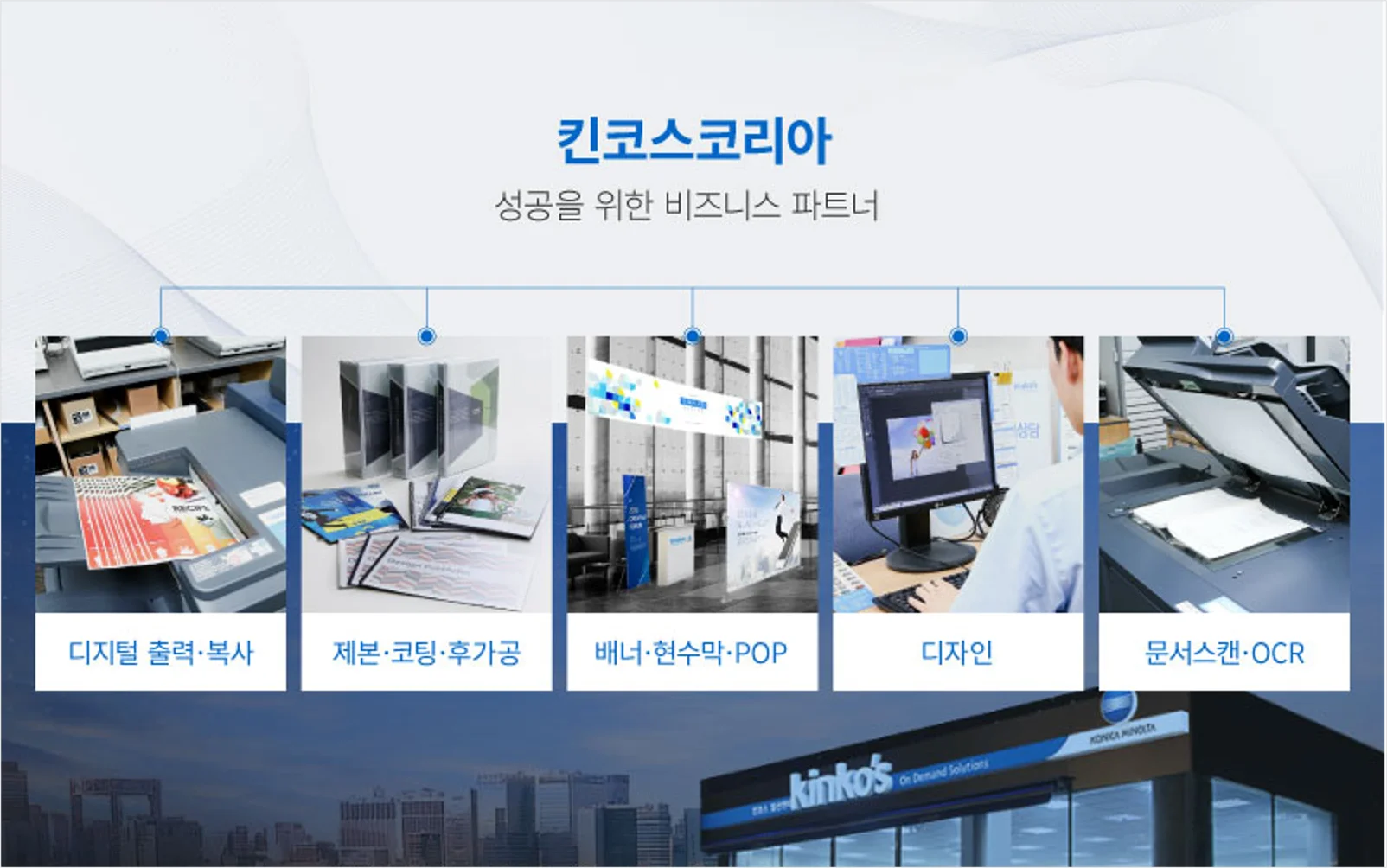 킨코스코리아는 고객의 On Demand에 대해 토탈솔루션을 제공하는 컨설턴트로서 컬러 출력, 제본, 디자인, Signs & Graphics 등의 다양한 솔루션과 비즈니스 서비스를 제공하고 있습니다. 1995년 창사 이래 20년 이상 지속해서 디지털 출력 시장의 발전을 위해 노력해 왔으며, 전문가에 의한 고품질의 디자인, 제본, 포장, 배송의 원스톱(One-stop) 서비스를 제공하는 비즈니스 성공파트너로서 차별화된 서비스를 경험해보시기 바랍니다.