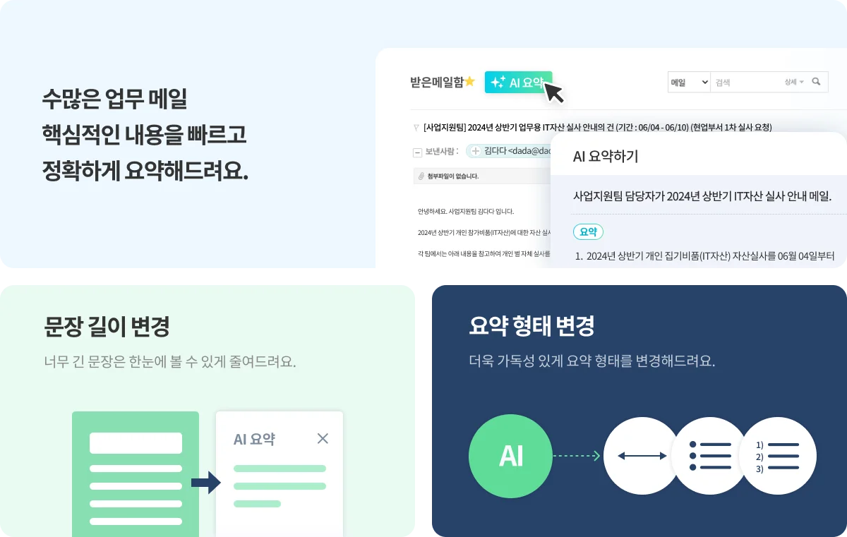 다우오피스 AI 메일 요약 기능은 업무 메일 속 핵심 내용을 빠르고 정확하게 요약해 줍니다.