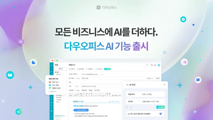 안녕하세요!올인원 업무플랫폼 다우오피스입니다. 다우오피스에 AI를 탑재한 ‘다우오피스 AI’ 기능이 드디어 출시되었습니다! 🎉  ✨ 다우오피스 AI로 어떤 업무가 쉬워질까요?현재 다우오피스에서는 주로 메일과 게시판 메뉴에서 AI 기능을 활용할 수 있습니다. 🤗 업무 효율을 높여줄 특별한 AI 기능들, 함께 살펴볼까요? 1. 메일의 핵심을 파악하여 빠르게 요약✔️ 핵심 내용 요약수많은 업무 메일, 모든 내용을 일일이 읽기 어렵지 않으셨나요? 다우오피스 AI 메일 요약 기능은 업무 메일 속 핵심 내용을 빠르고 정확하게 요약해 줍니다.꼭 읽어야 할 중요한 포인트만 바로 확인할 수 있어요!✔️ 문장 길이 변경 긴 메일을 읽다 보면 중요한 정보를 놓치기 쉽죠. 너무 길어 부담스러운 문장을 간결하게 정리해, 한..