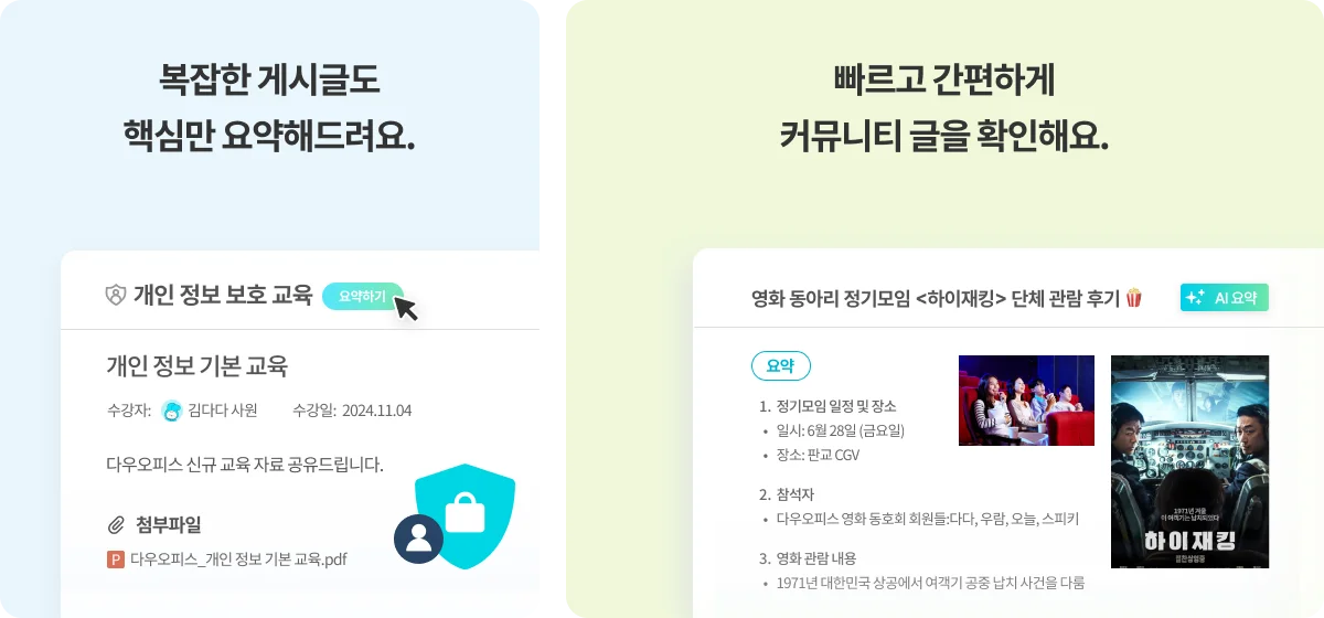 교육 공지, 회의 자료, 프로젝트 업데이트 등 긴 게시글에서 중요 포인트만 요약하여 한눈에 보여줍니다.