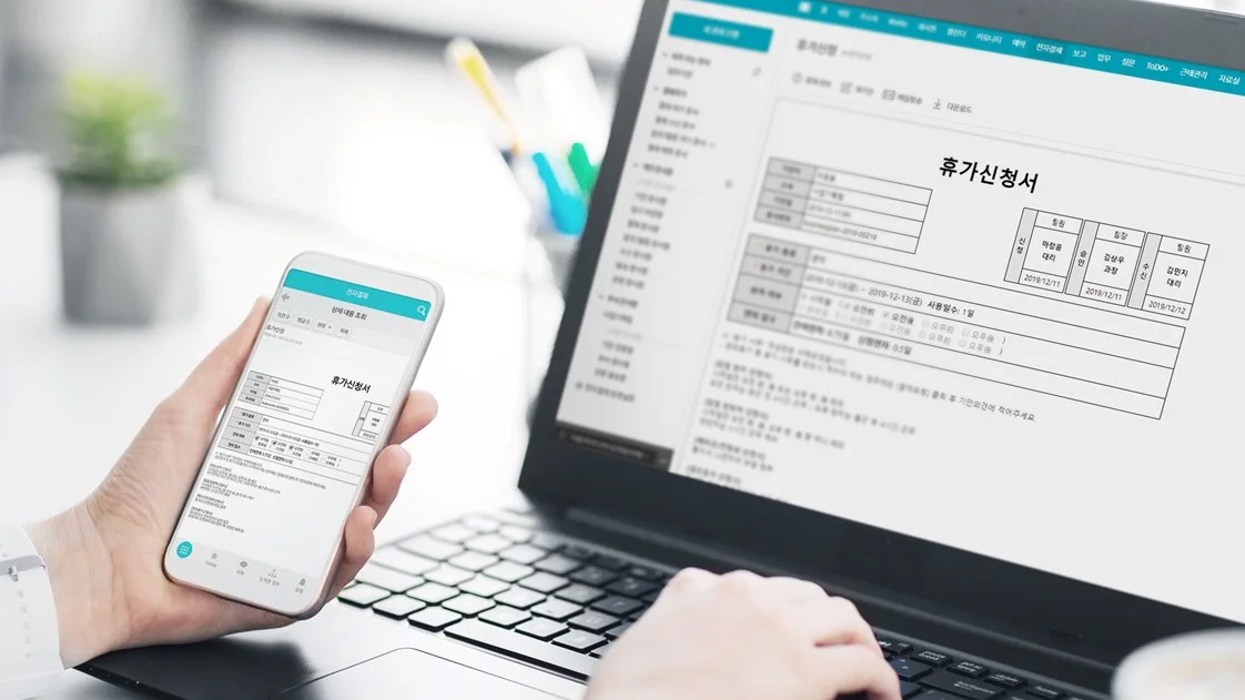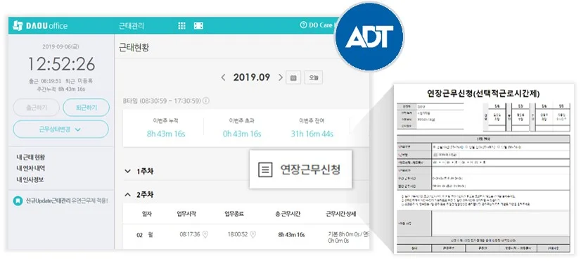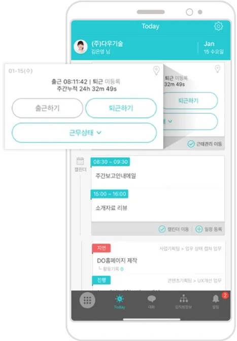 다우오피스 전자결재 기능 연동으로 연차 사용 및 연장근무 결재 시 근태 현황이 자동 반영됩니다.