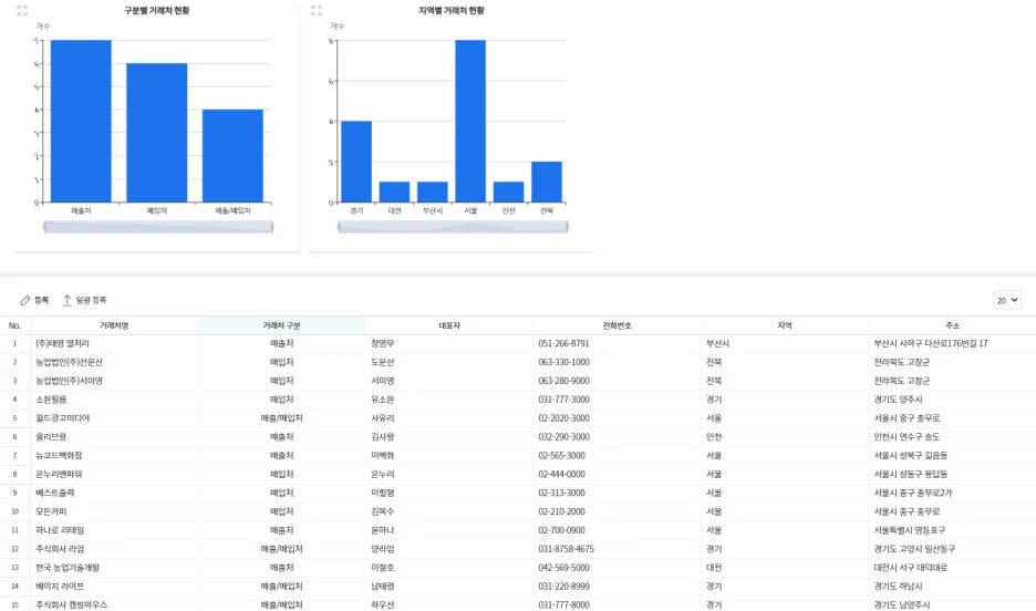 그래프를 통해 매출/매입 구분 또는 지역별로 등록되어 있는 거래처 현황 파악이 가능하며,