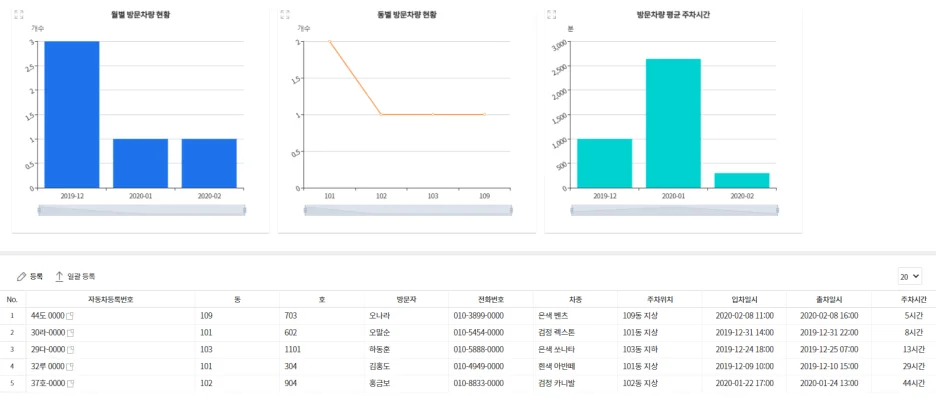 그래프를 통해 주차 관리 업무 현황(월별, 동별 방문차량, 평균 주차시간)과