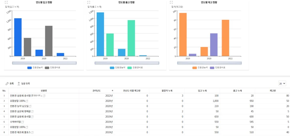 연도별 입출고와 재고 현황, 관리 연도를 그래프로 확인할 수 있으며,