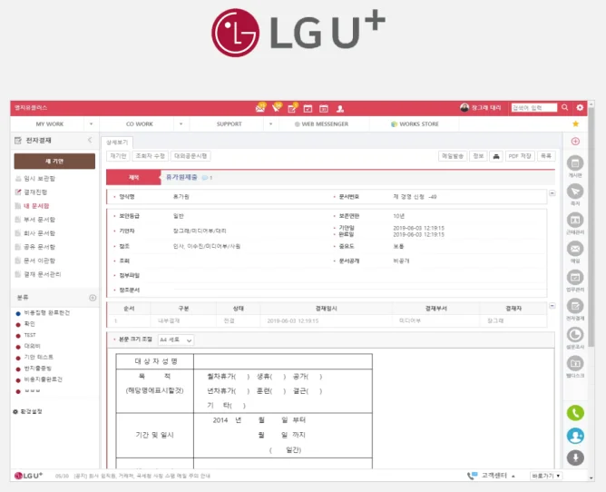 KT비즈메카이지와 LG U+웍스의 전자결재 기능 화면입니다.