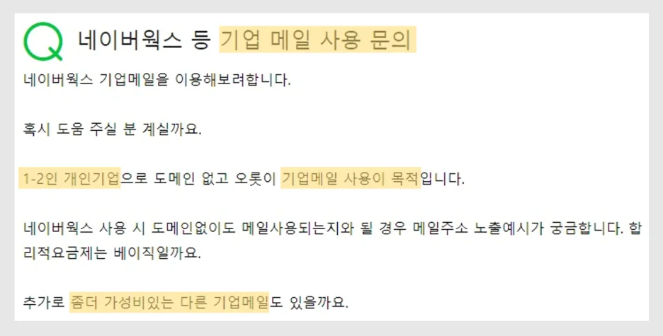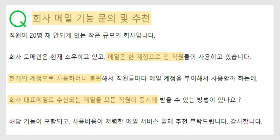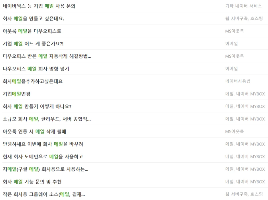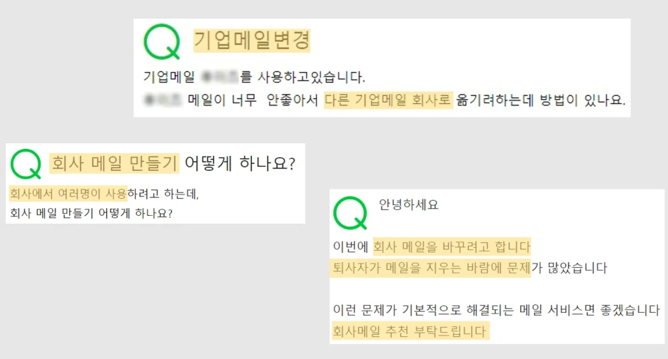 현재 사용 중인 기업 메일을 변경하길 원하시는 질문이 가장 많았는데요.