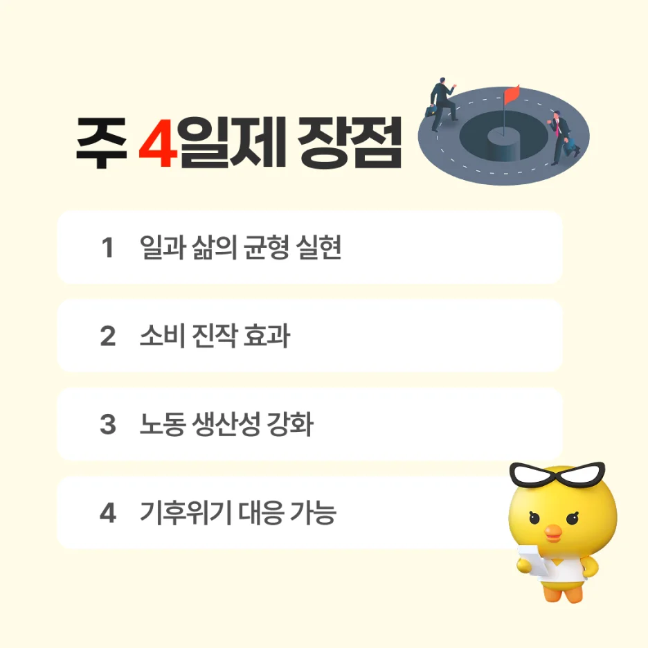 ์ฃผ 4์ผ์ ๋ ๋ง ๊ทธ๋๋ก, ์ฃผ๋น ๊ทผ๋ฌด์ผ์ ๊ธฐ์กด 5์ผ์์ 4์ผ๋ก ์ค์ด๋ ๊ทผ๋ฌด ํํ์ ๋๋ค.