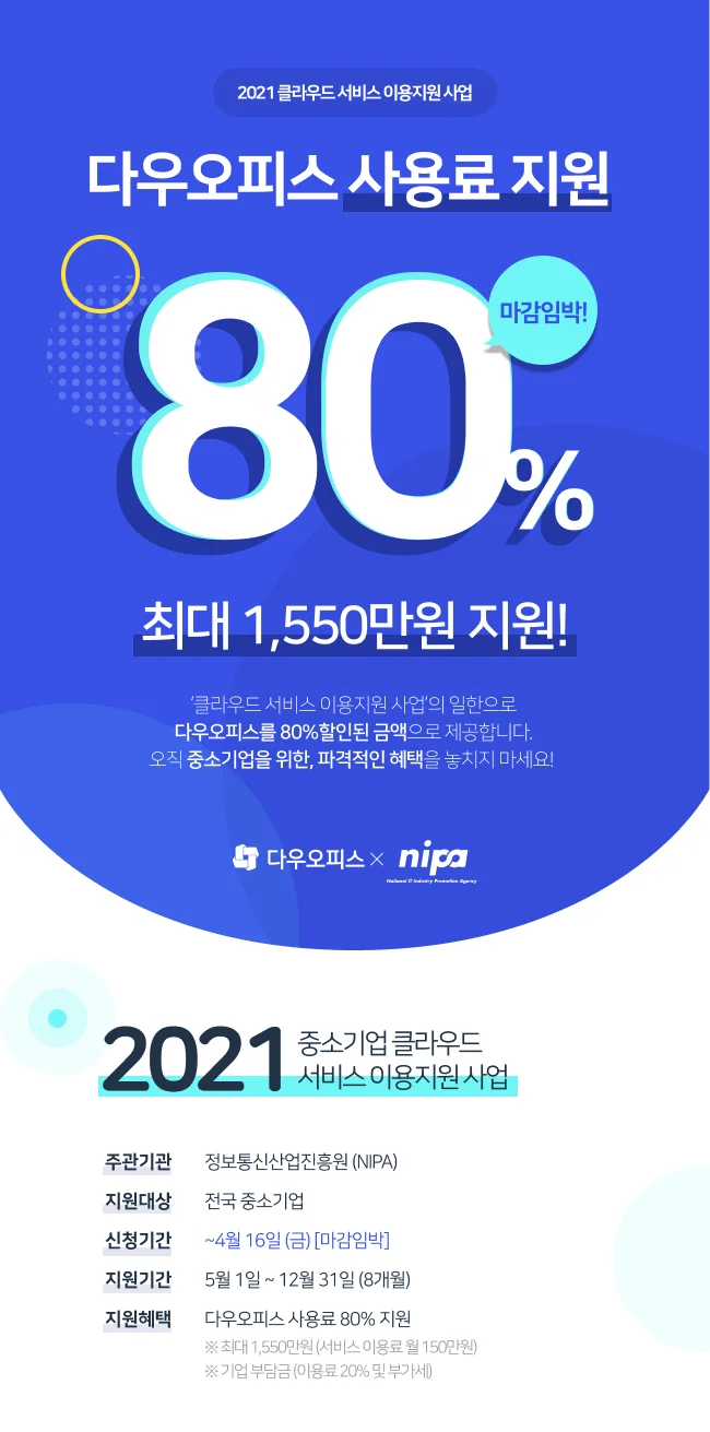 - 본 정부지원사업은 종료되었습니다. - 안녕하세요. 다우오피스입니다! 2021년 중소기업 클라우드 서비스 이용지원 사업 소식에 대해 전해드리려고 합니다 🙂 클라우드 서비스 지원사업을 통해 다우오피스를 무려 80% 할인된 금액으로 이용하실 수 있는데요! 지원마감이 4월 16일(금)까지 라고 하니 서둘러 신청하시기 바랍니다! 자세한 내용 확인해보실까요 ▼