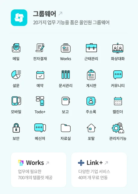 20가지의 다양한 그룹웨어 기능을 제공해 드리고 있습니다.