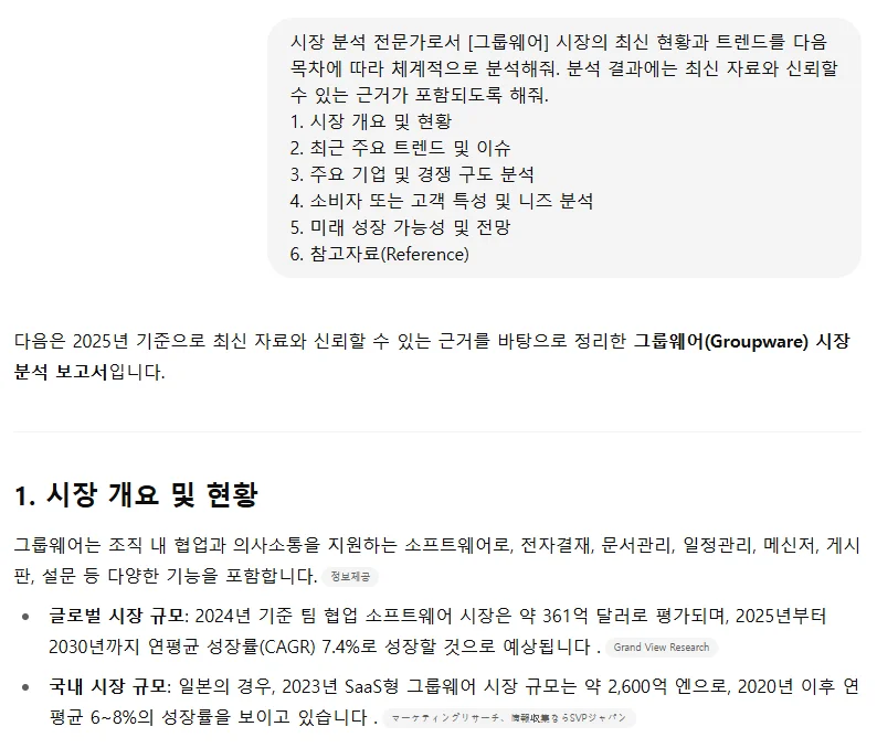 주요 수치도 함께 제시해주어, 이 프롬프트를 활용한다면 시장 분석의 구조를 잡기 훨씬 편리할 것 같아요.