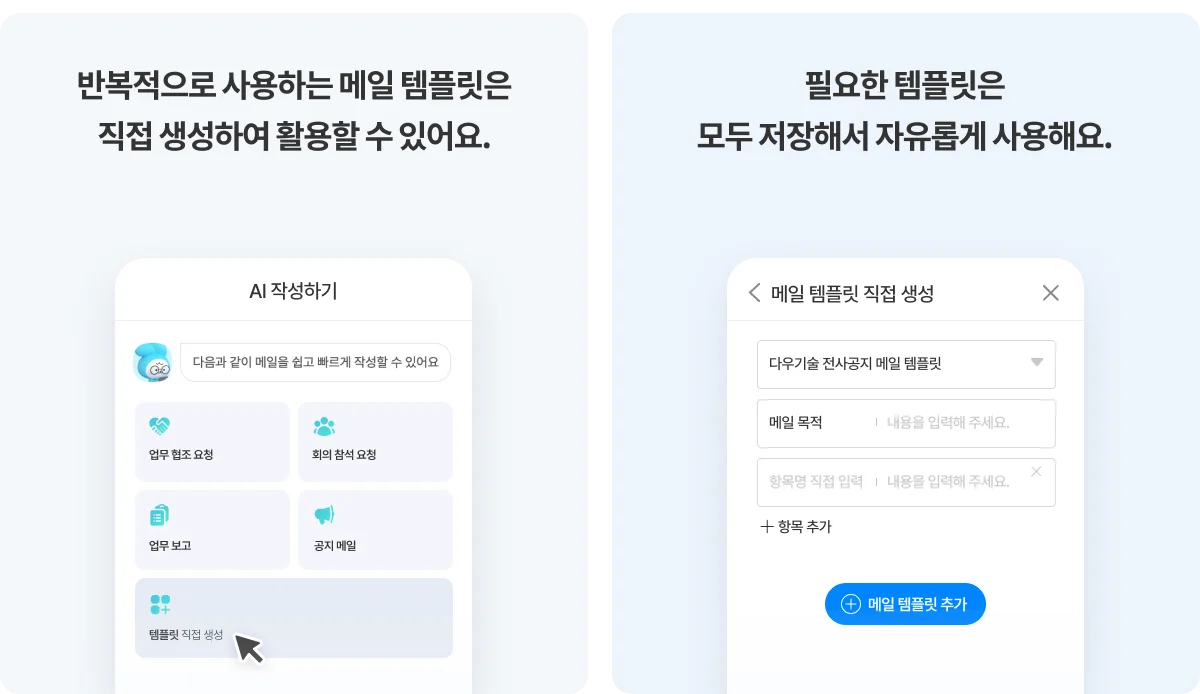 - 맞춤형 템플릿 생성: 자주 사용하는 나만의 메일 형식이 있다면 맞춤 템플릿을 만들어 보세요! 필요한 메일 템플릿을 추가하여 보다 빠르게 메일을 작성할 수 있죠.