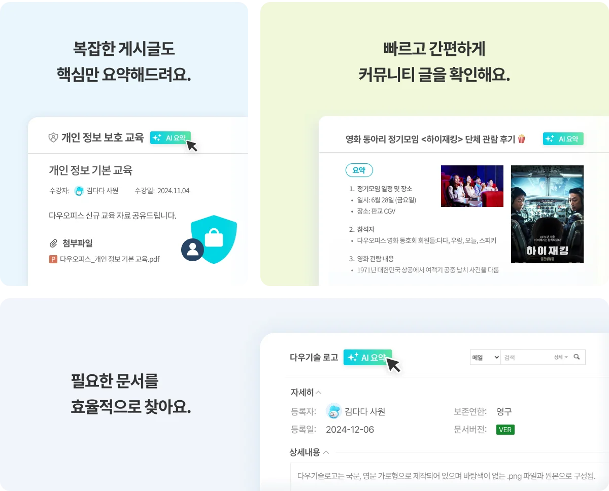 다우오피스의 [AI 요약] 기능으로 복잡한 게시글과 문서에서 핵심 내용만 확인해 보세요!