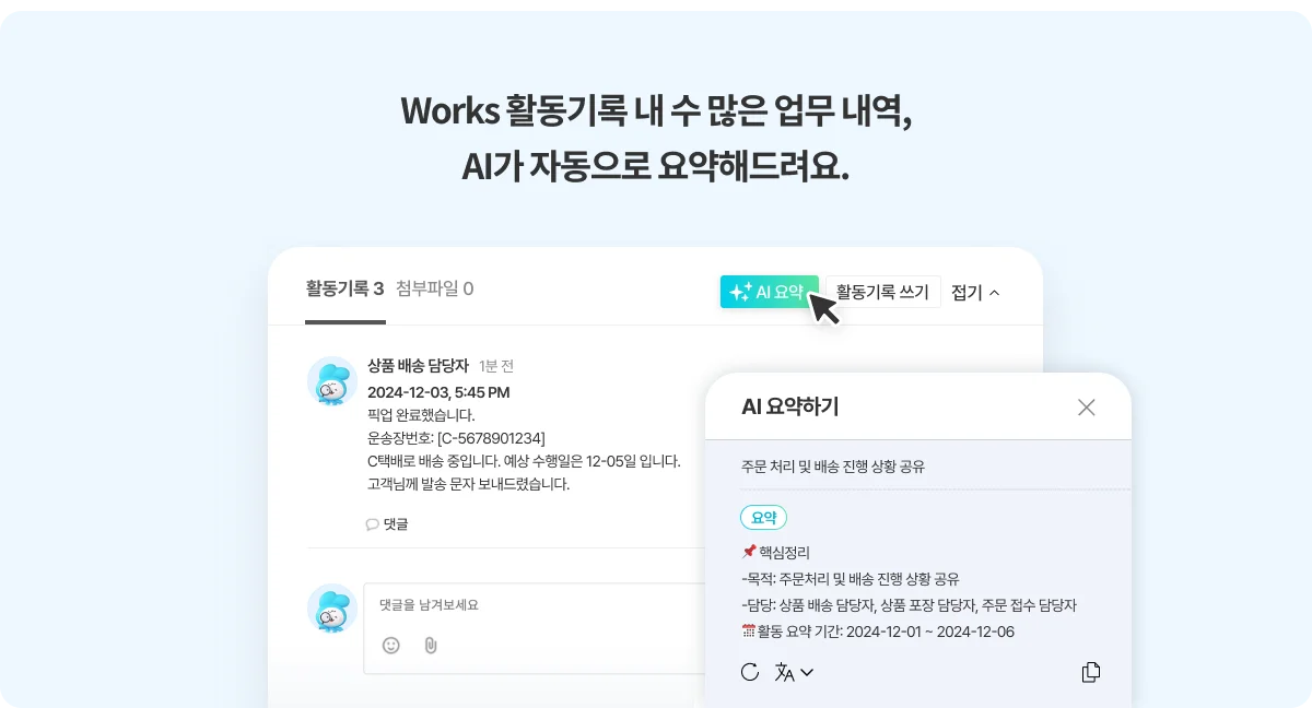 Works의 수많은 업무 내역, [AI 요약] 기능으로 핵심만 한눈에 확인할 수 있어요!