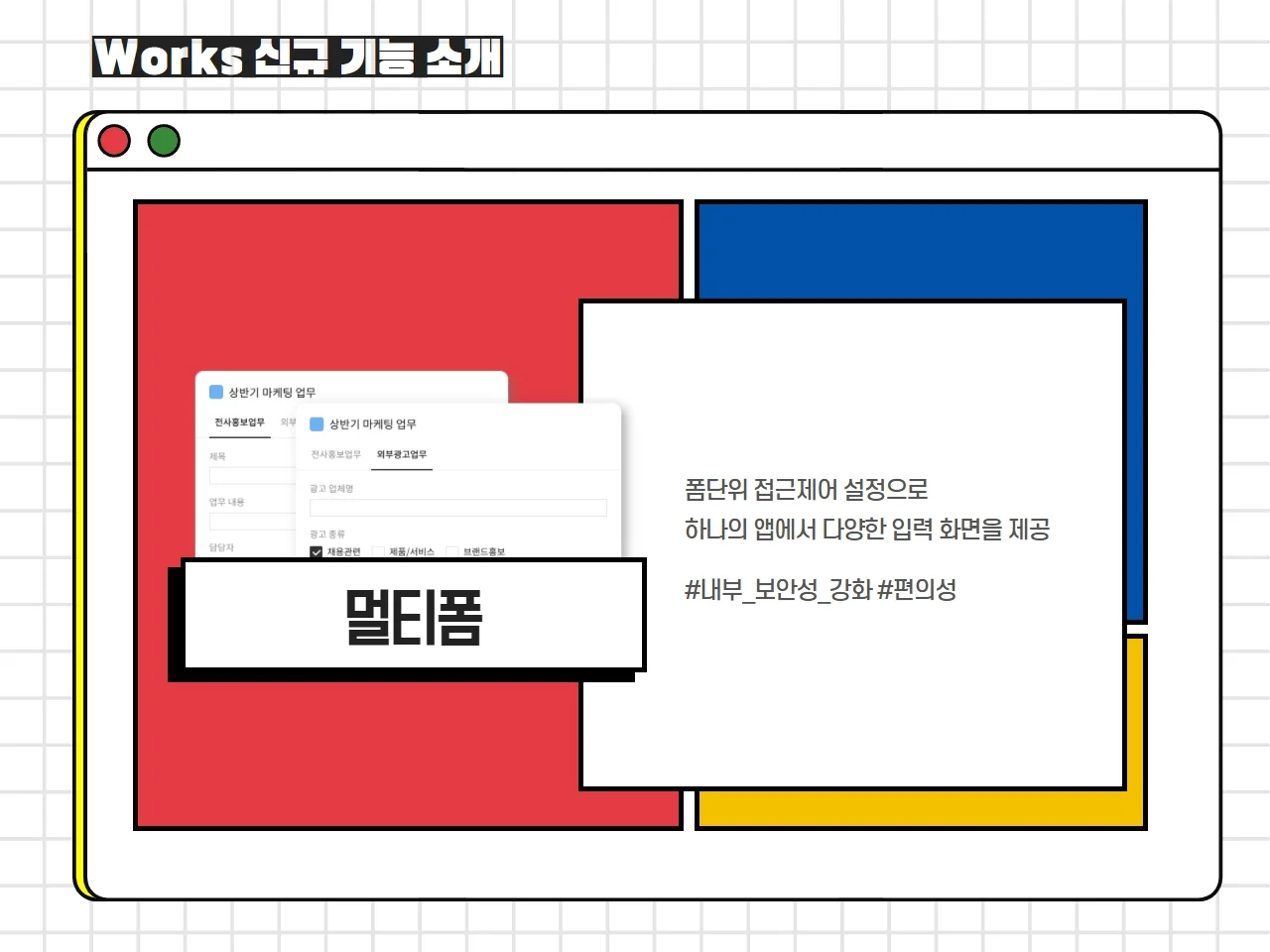 멀티폼은 폼단위 접근제어 설정으로 하나의 앱에서 다양한 입력화면을 제공하며,
