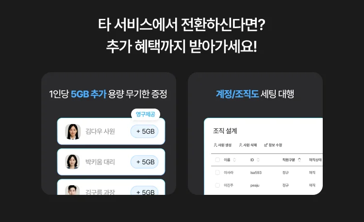 κΈ°λ³Έ μ 곡 μ©λμ λν΄, +100GB λμ©λ νμΌλ λΆλ΄ μμ΄ μ μ₯ κ°λ₯!